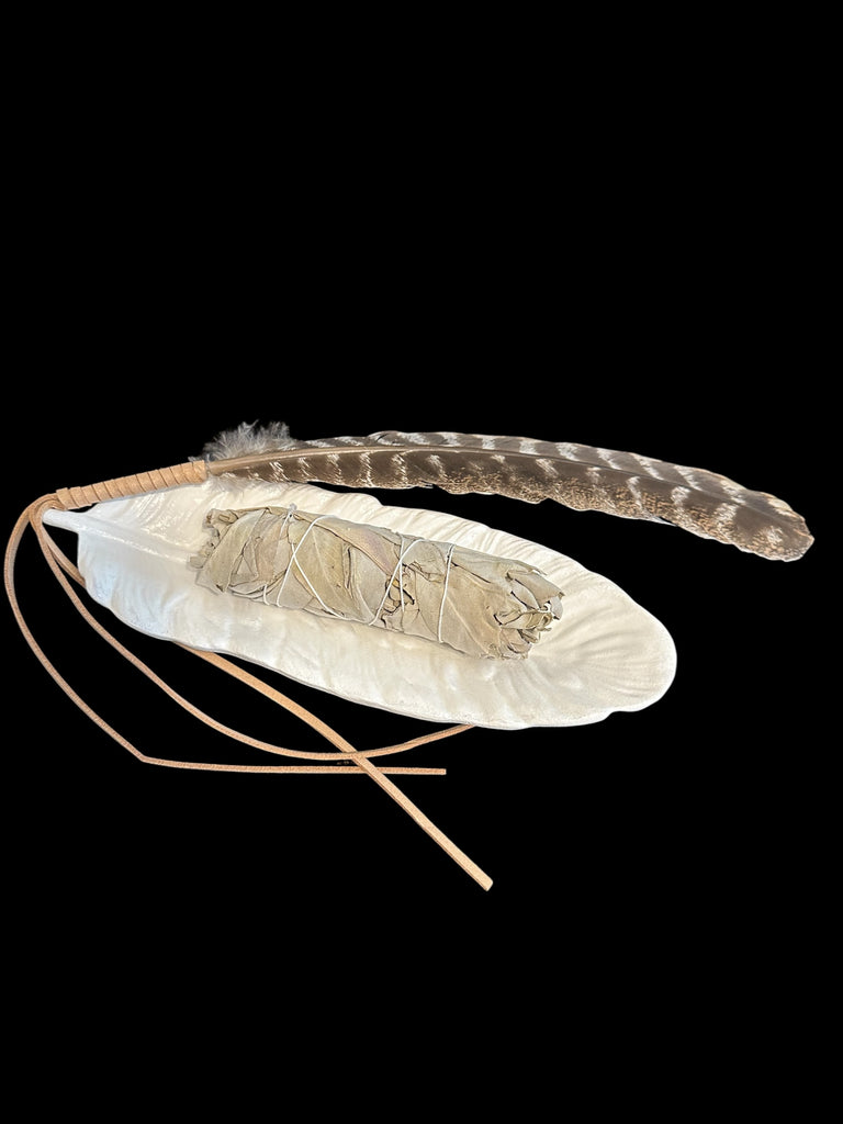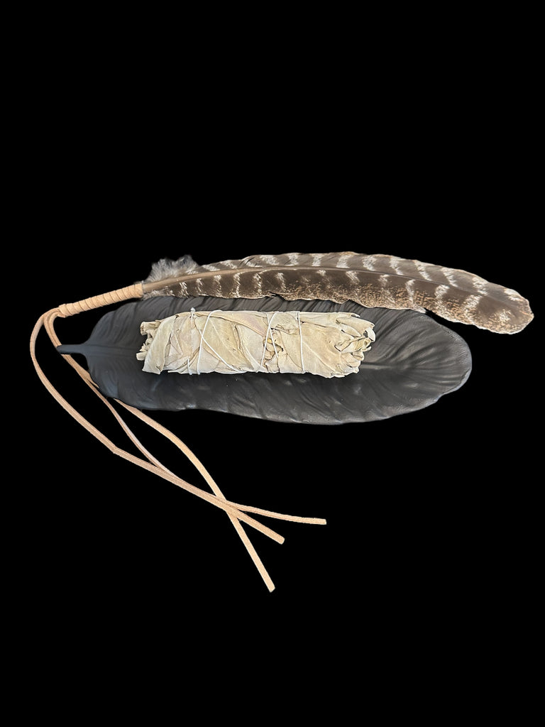 Enhance your smudging rituals with this smudging kit featuring organic sage, feather tray and a turkey feather. Designed for precise and respectful handling of sacred herbs, the tray provides a safe, elegant surface for burning sage, while the feather aids in gently dispersing the smoke. Ideal for cleansing spaces and promoting positive energy, this kit supports traditional practices with quality and authenticity.