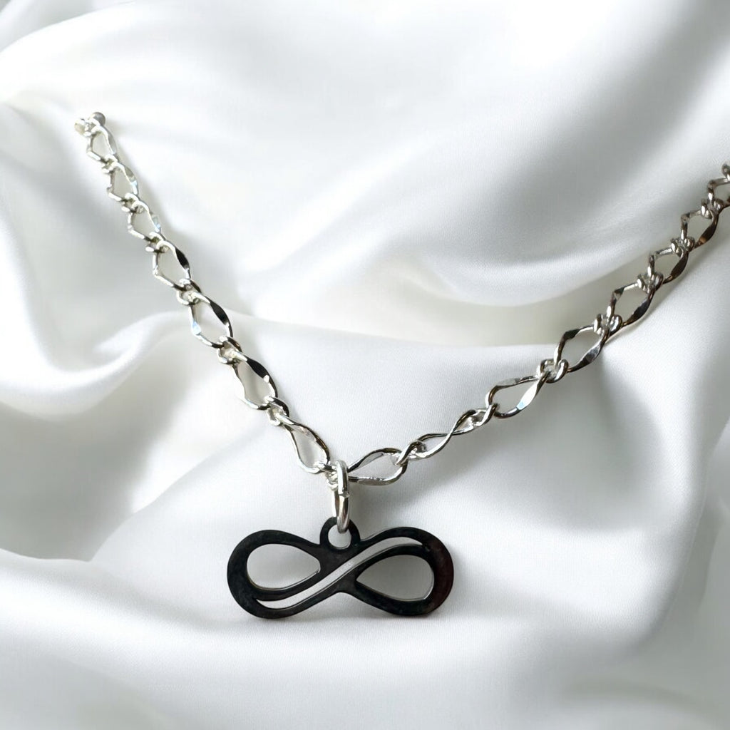 This Infinity Pendant Necklace is crafted from non-tarnish stainless steel and comes with a adjustable chain. Infinity pendant measures 7.5mm x 17.5mm.